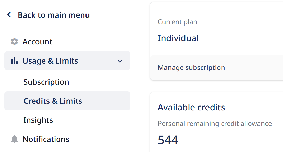 To view your remaining credits, Select the tab Settings in the lower left corner of your home screen in Transkribus and go to "Usage&Limits" and there click on "Credits&Limits".