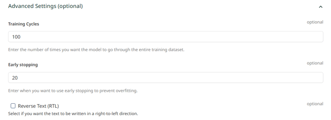 For this reason, we recommend creating varied Validation Data containing all types of hands and document typologies present in the Training Data. Only if your Validation Data is rather small, increase the “Early Stopping” value in order to avoid the training from stopping before it has seen all the Training Data. Always bear in mind, however, that by increasing this value the training will take longer. - Reverse text (RTL):