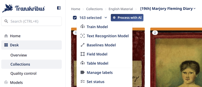 You can start the training directly from the collection or document(s) you've been working on. Simply mark the transcribed or corrected pages, then click on the "Selected" button in the bar above the images. There click on "Train Model" and select "Text Recognition Model".