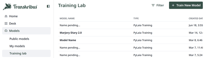 Under the section "Training Lab" you can find all the models you trained and the co-relating training data. By clicking on "+ Train New Model" you can also start the training from here.