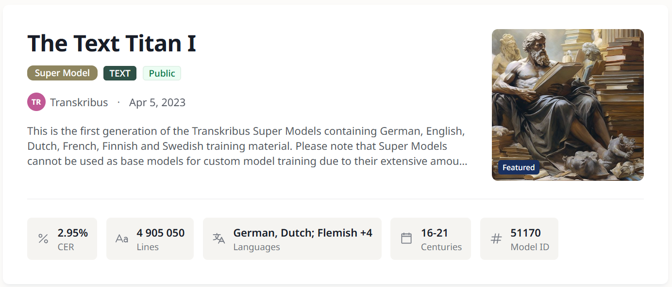 Transformer-based text recognition models - or Super Models - are great at dealing with natural language, which helps them decipher all sorts of written materials. They are able to outperform existing PyLaia models by a significant margin.