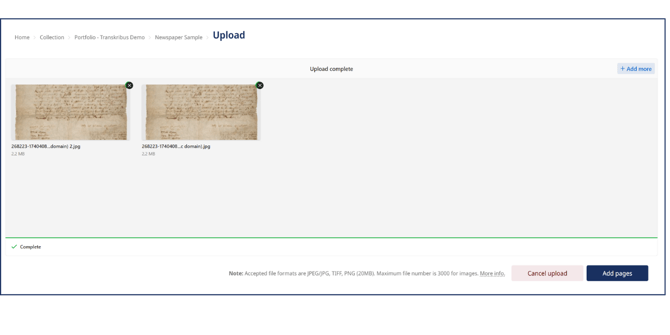 After adding and arranging the pages, you can continue to process or transcribe the document as usual.